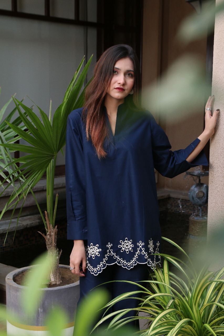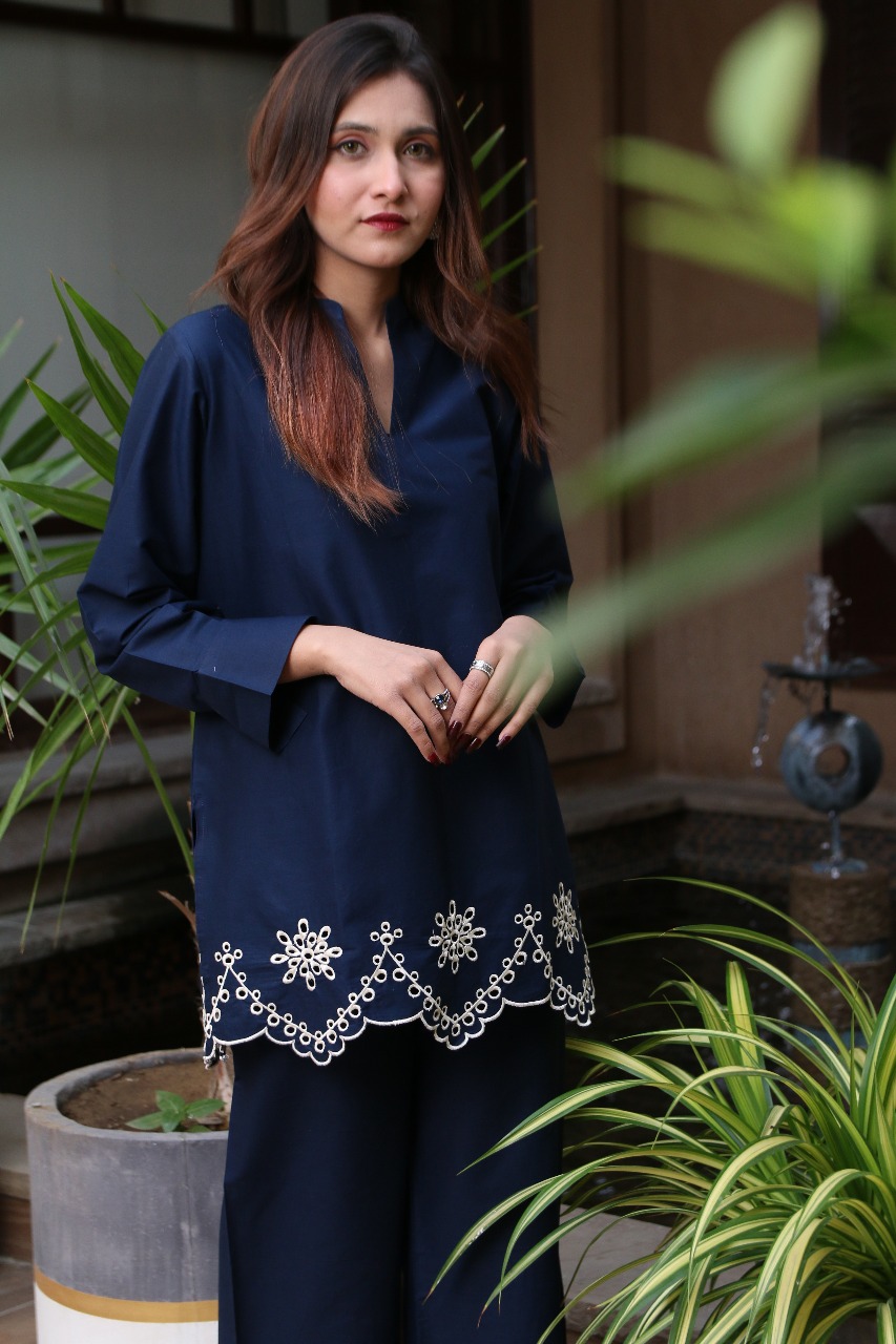 Blue cotton matching co-ord set with a band collar v neck and cuff sleeves. Intricate embroidery details on hem and izhar. Relaxed fit for ultimate comfort.