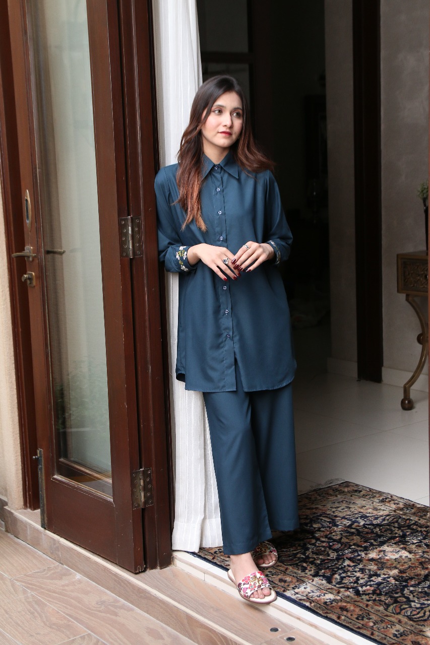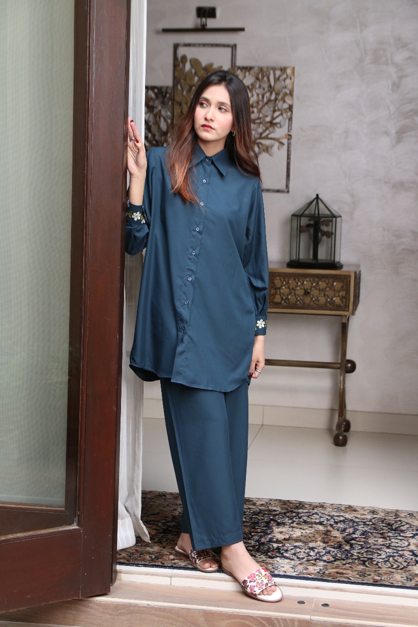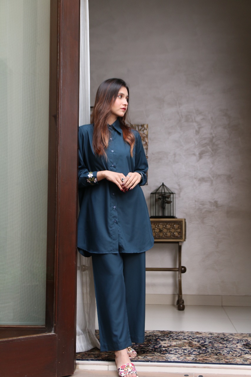 A two-piece button-down set crafted from a lightweight, breathable blended fabric. Finished with a delicate floral embroidery on the cuffs for an elegant touch.