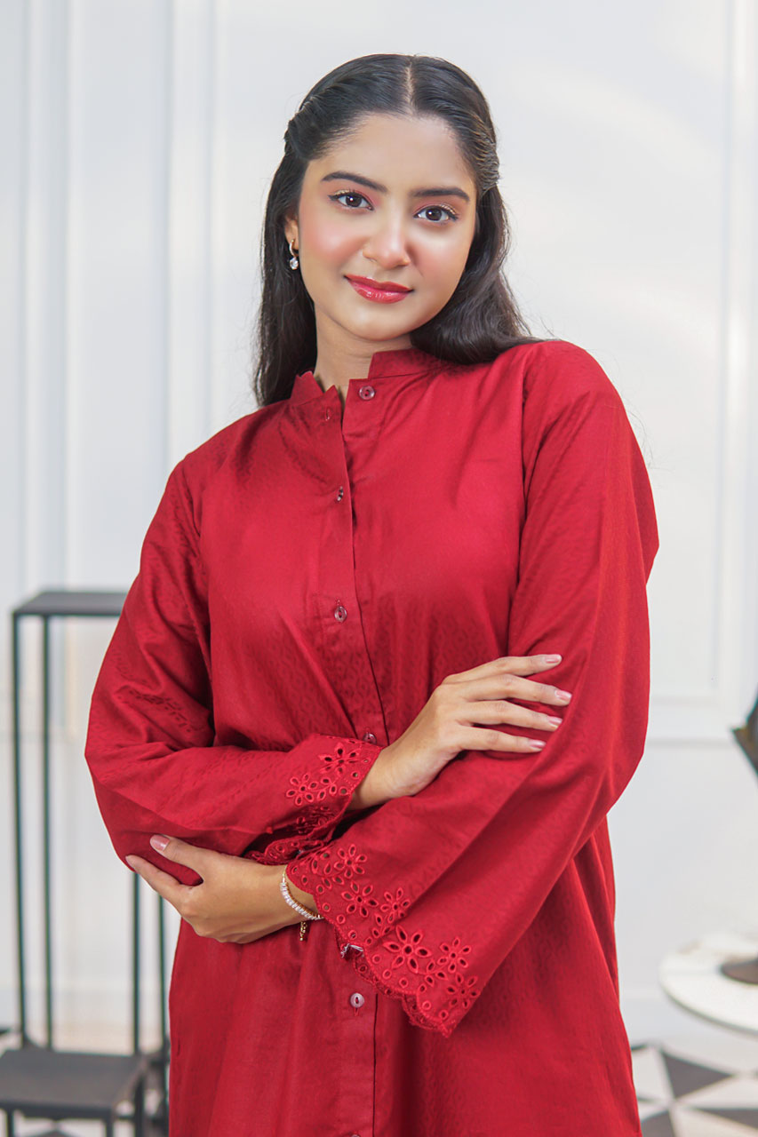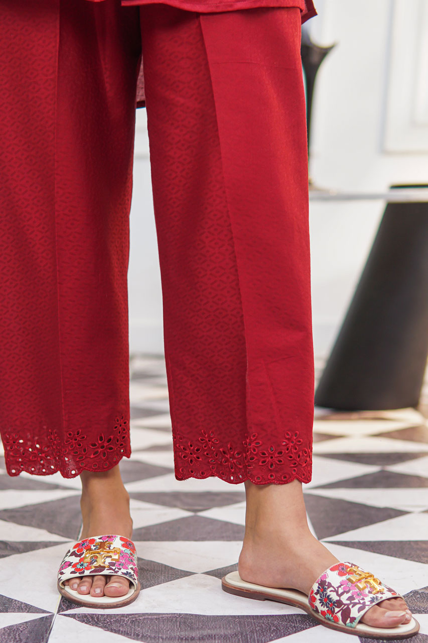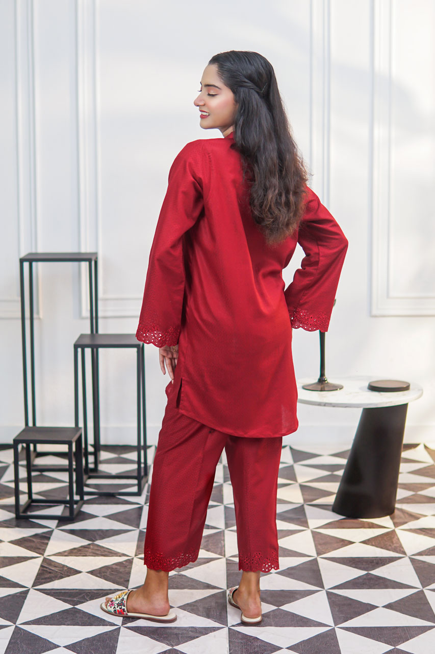 A two-piece button-down set crafted from soft cotton jacquard, featuring intricate cutwork detailing on the sleeves and pants for a refined, elegant finish.