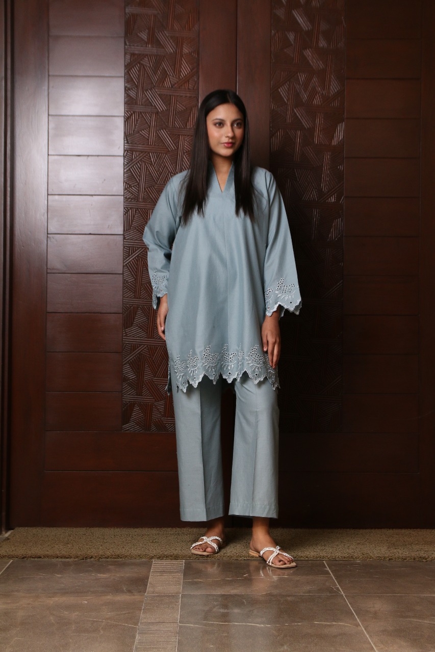 Just as the name suggests — cool and breezy for everyday wear. This light ice-blue cotton co-ord set features delicate embroidery along the hemline and sleeves, paired with straight cut pants for a clean, minimal look.