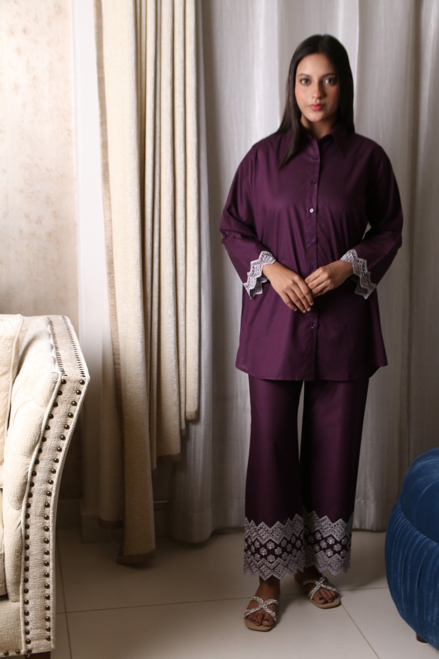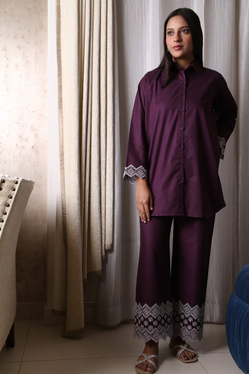 This deep purple button-down set is designed for a minimalistic yet elegant look. It features intricately embroidered culottes paired with subtle embroidery on the sleeves, making it the perfect choice for an evening outing.